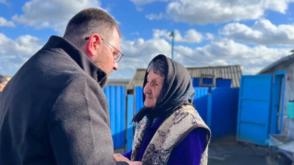 Bischof Maksym Ryabukha im Gespräch mit einer alten Frau © Kirche in Not